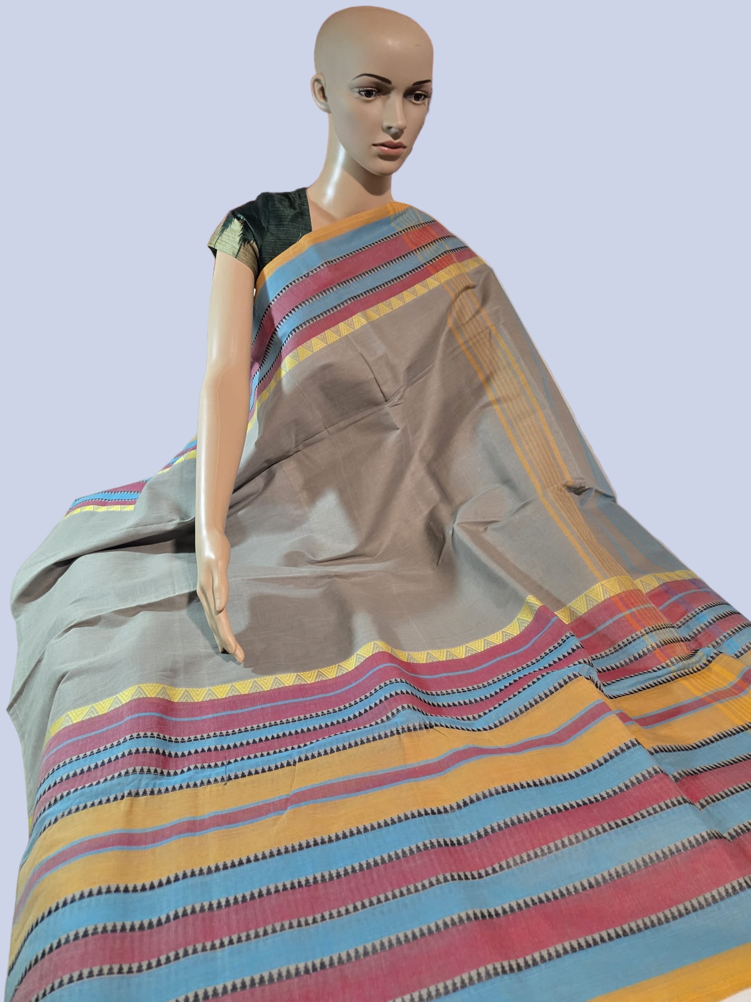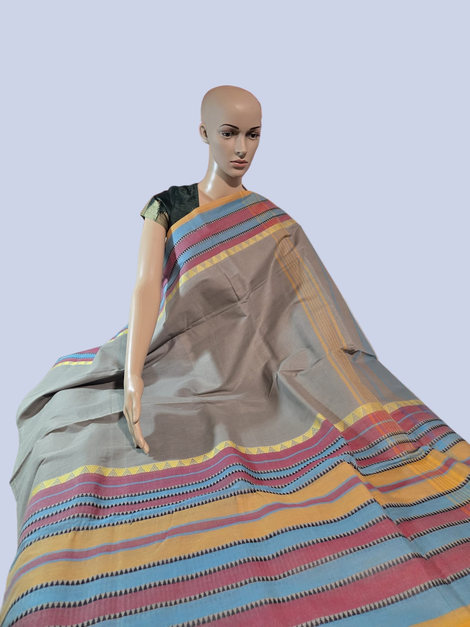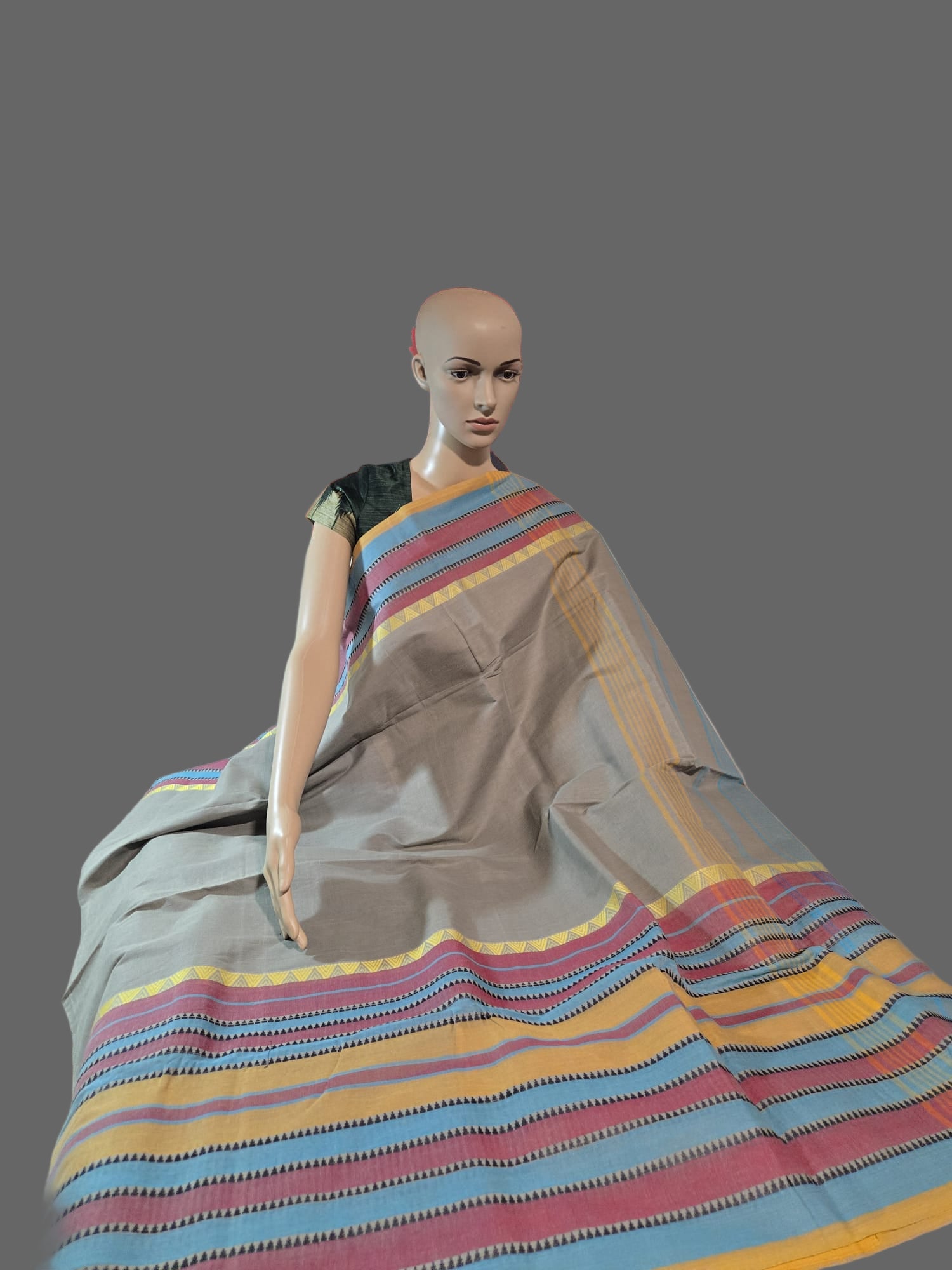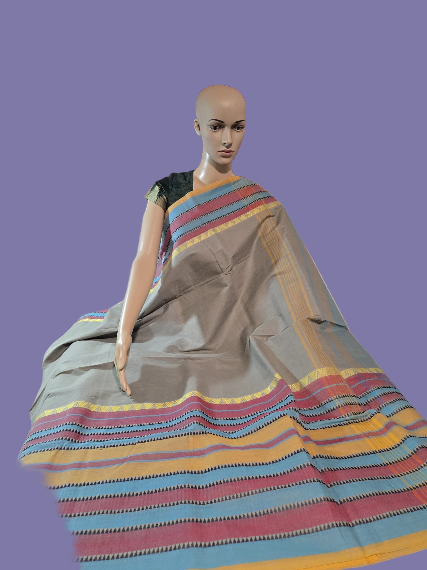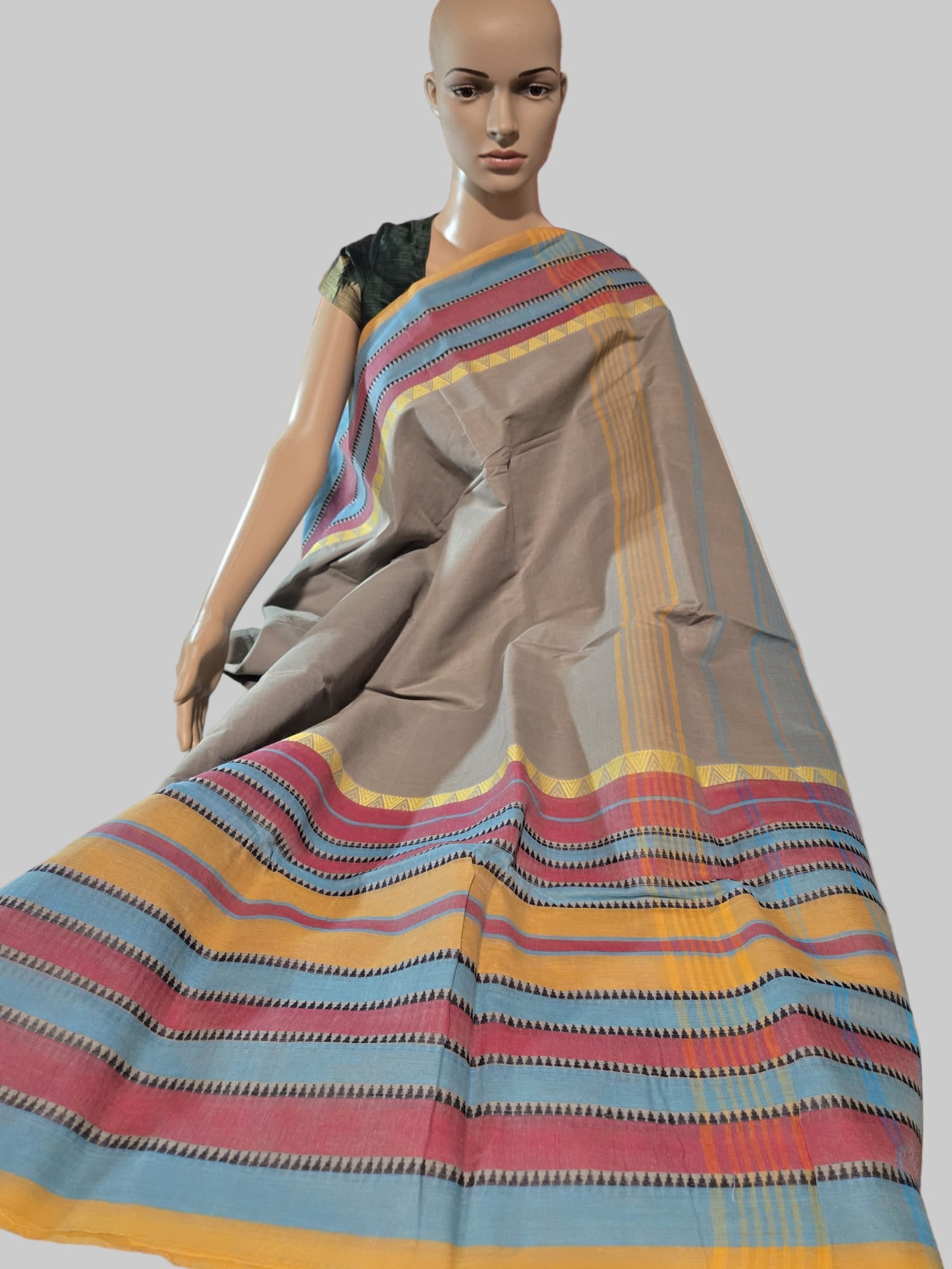 Crafted from 100% handloom cotton, this saree offers a soft, lightweight texture ideal for all-day wear, especially during festivals or traditional functions. It is beautifully complemented by blouse piece with borders that adds a striking visual balance.