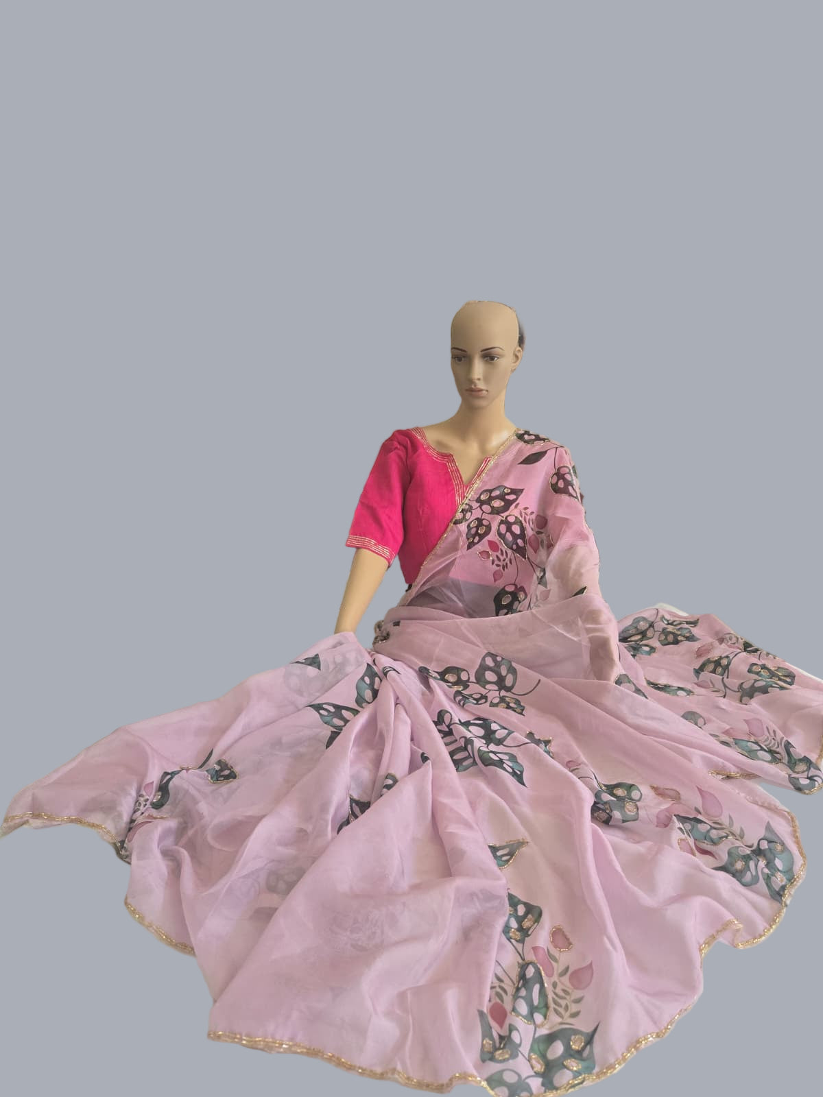 Tebby Embroidery Silk Saree with Stitched Blouse Buy from USA with Floral Print & Handwork Khatli Cutdana Border