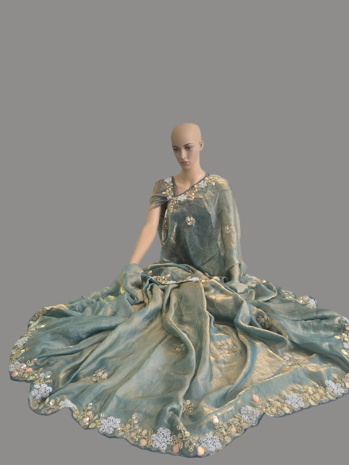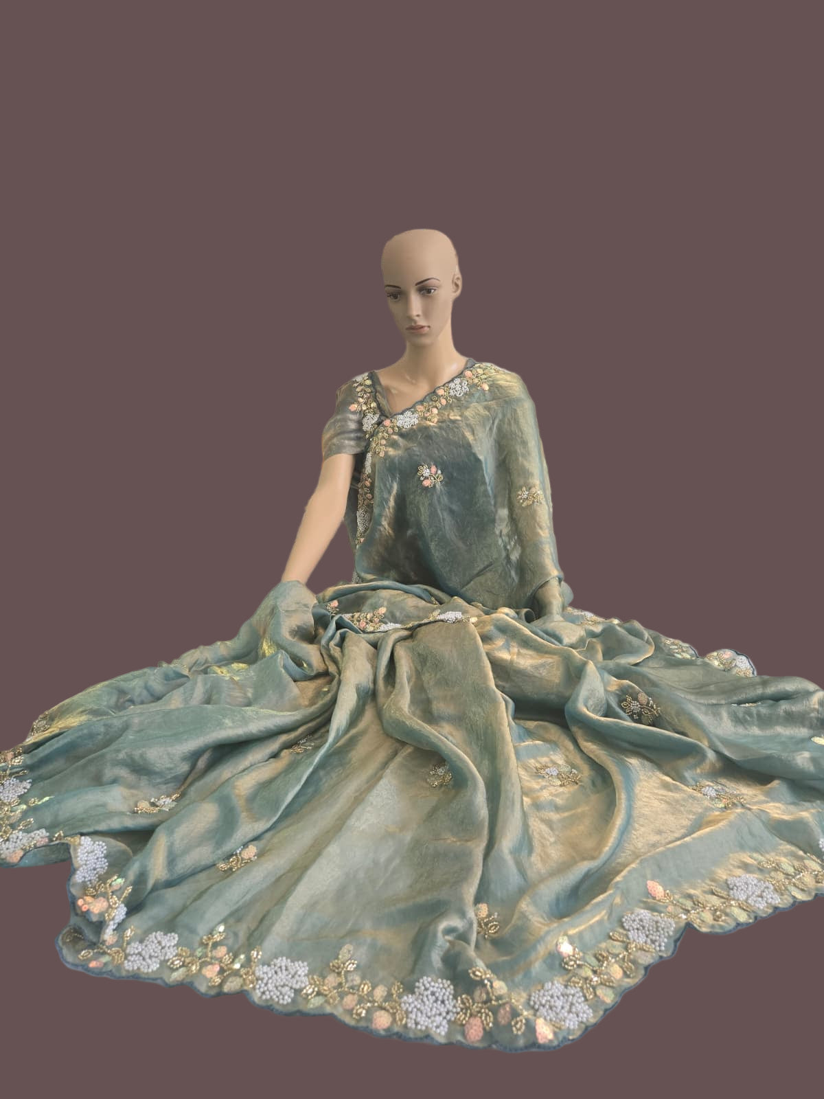 The saree drapes gracefully, offering a soft sheen and lightweight comfort, making it perfect for parties, receptions, and festive occasions. Paired with a matching Fandy Satin blouse embellished with Brits embroidery, this ensemble blends glamour and sophistication perfectly.