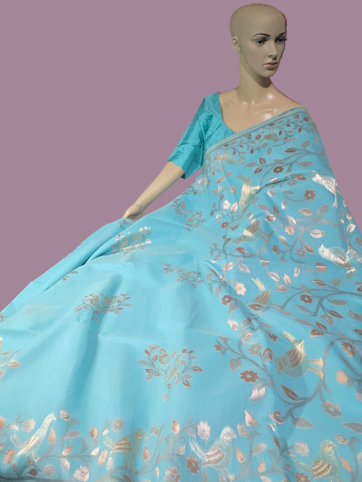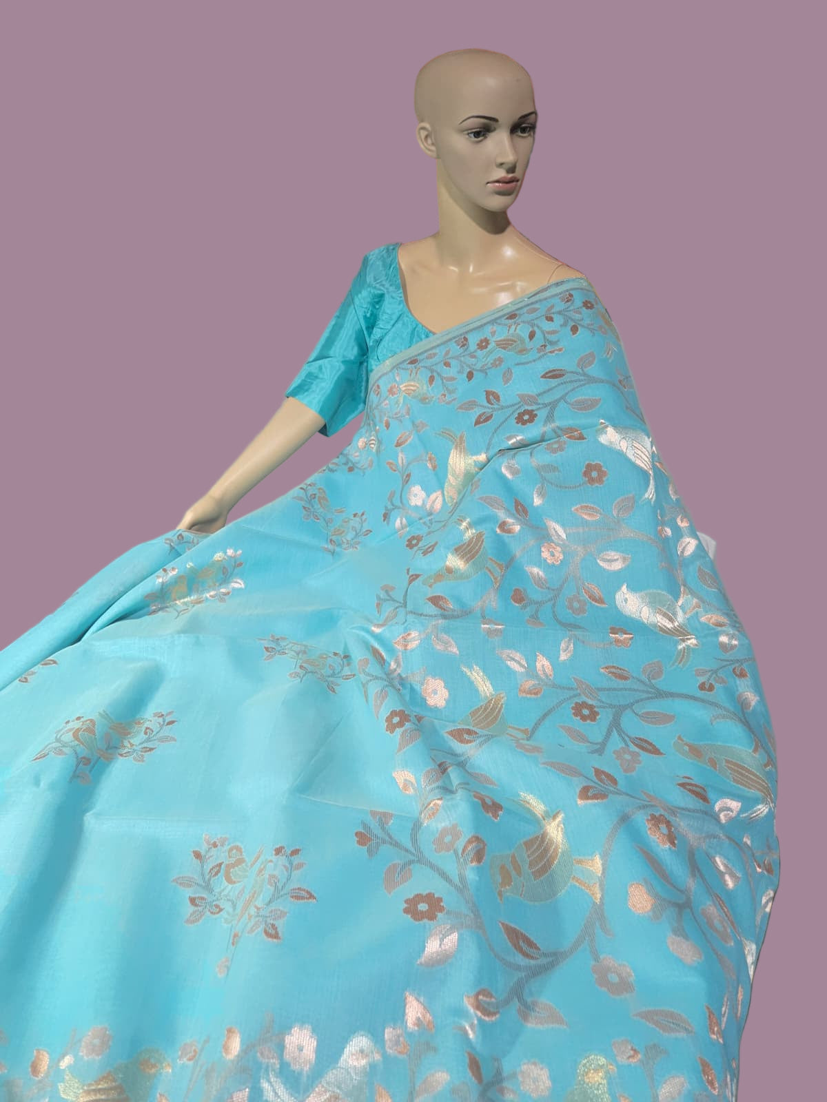 Handloom Khadi Cotton Silk Jamdani Saree – Lightweight & Elegant Traditional Weave Embroidery- Blue
