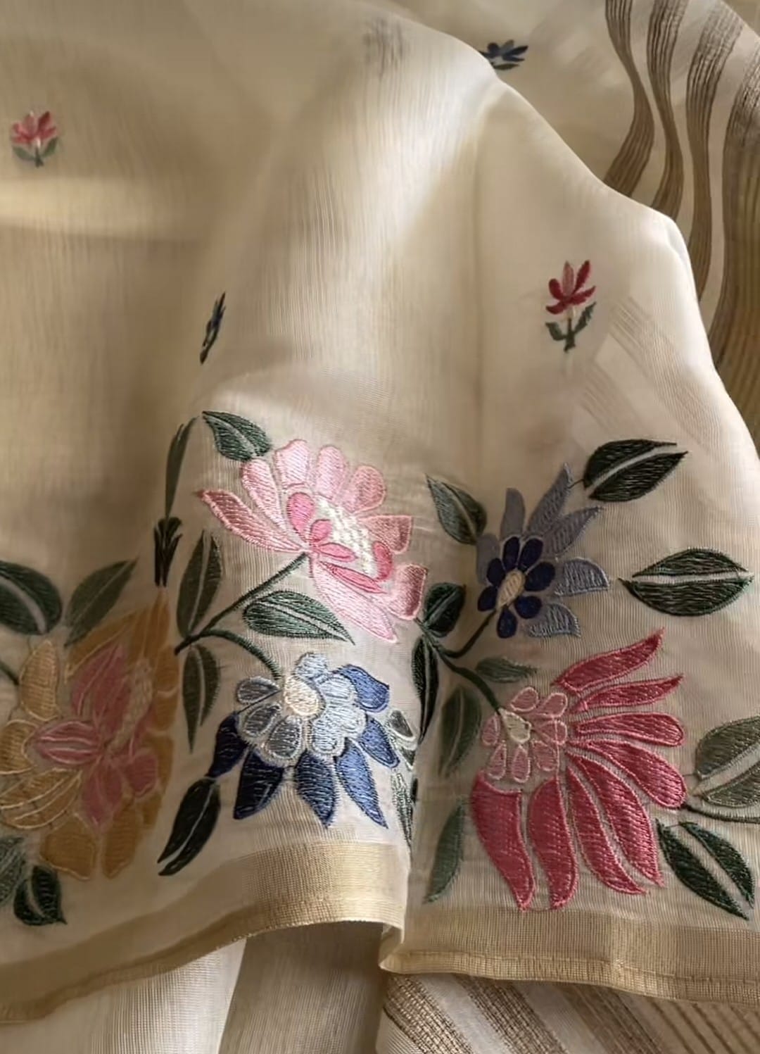 Whether you're attending a garden party, a wedding ceremony, or a festive gathering, this exquisite saree makes a statement of refined elegance and seasonal charm. Pair it with simple accessories to let the embroidery shine, or dress it up for a more regal look—this saree is as versatile as it is beautiful.