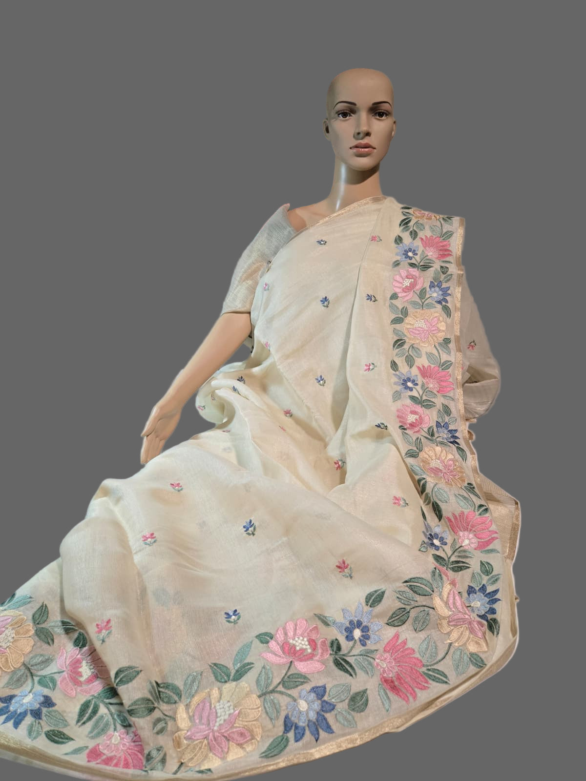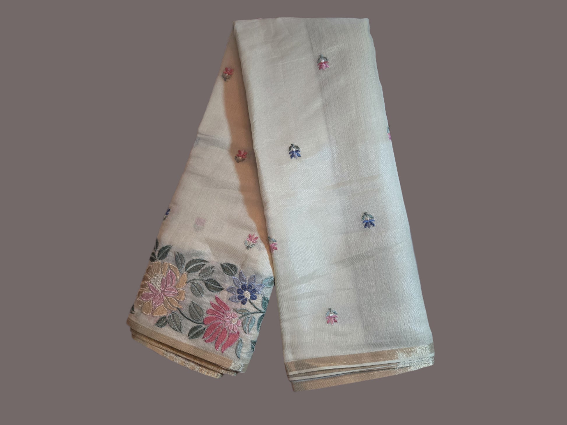 Breathe new life into your festive wardrobe with this ivory-toned Chappa silk saree—a perfect blend of elegance, tradition, and artistic detail. The soft cream base is adorned with intricate multicolor floral embroidery, featuring delicate blooms along the border and scattered buttas throughout, adding a touch of color and vibrancy without overwhelming the graceful tone.