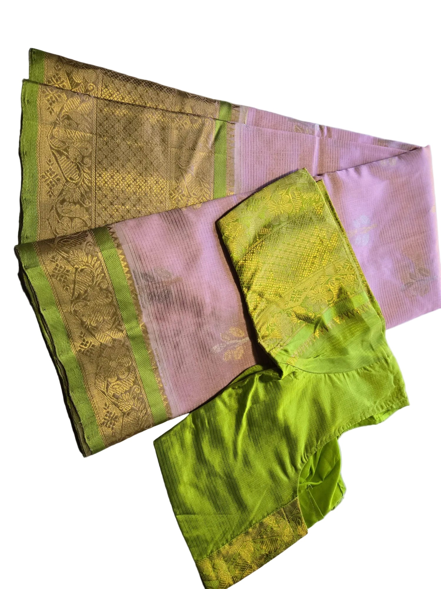 Pure Silk Handloom Saree with Stitched Blouse in Baby Pink with Green Contrast Border – Festive Wear Party Wear Saree USA
