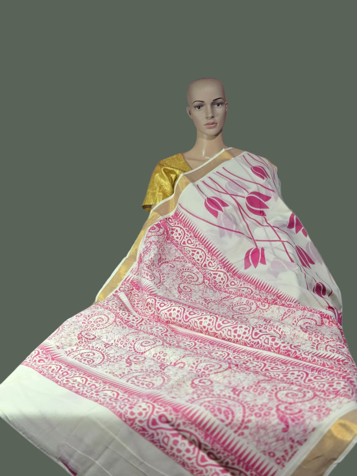 Stay elegant and comfortable this festive season with our Printed Kerala Cotton Saree, a perfect blend of tradition and breathability. Ideal for Onam celebrations, this saree features soft, weightless pure cotton fabric that keeps you cool in summer while offering a graceful drape.