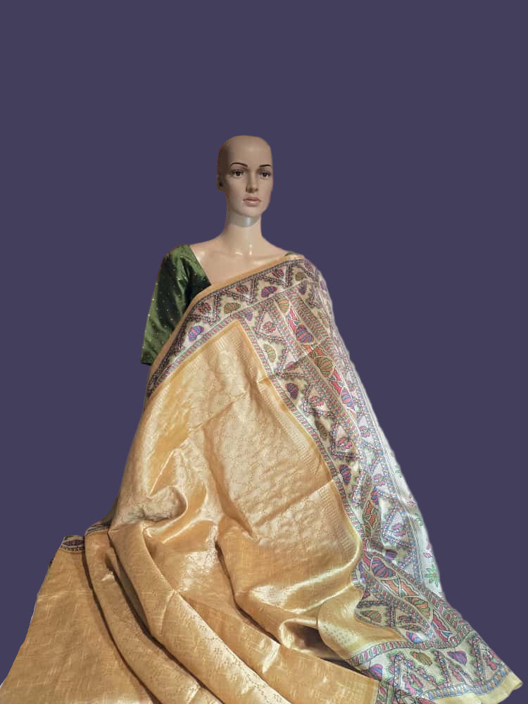 Tusser Silk Saree Madhubani Print Border in Sandal & Beige with Stitched Blouse Allover Zari Weaving and – Handcrafted Traditional Saree for Bridal & Festive Occasions